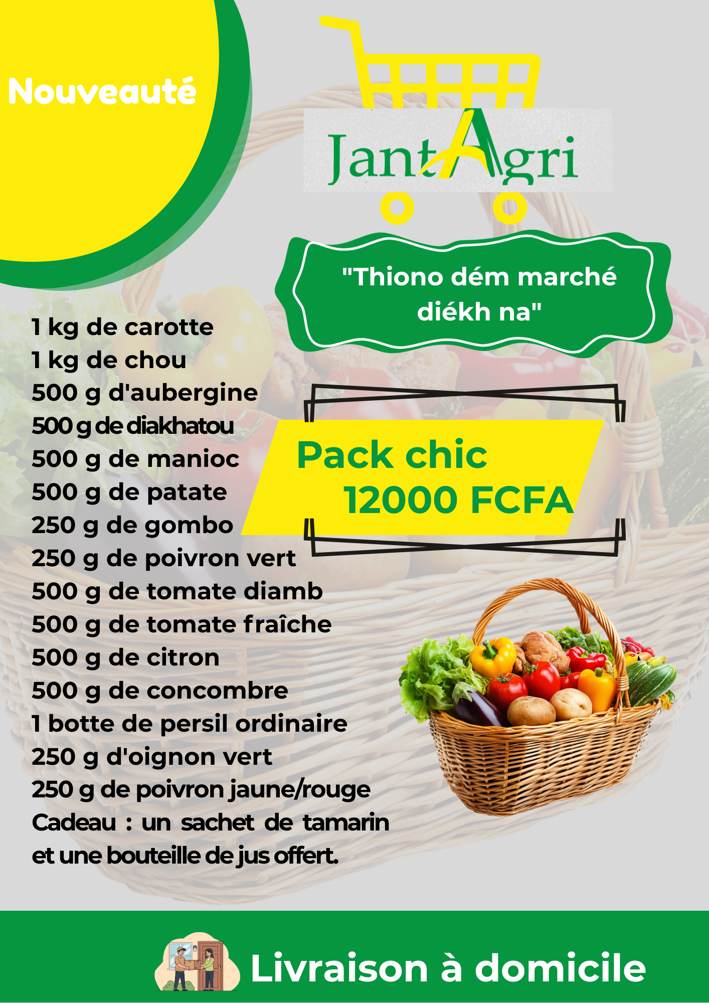 Fini la fatigue du marché avec le Pack Chic de Jant Agri. Ce panier complet est conçu pour répondre aux besoins quotidiens des familles recherchant qualité et fraîcheur. Il comprend :